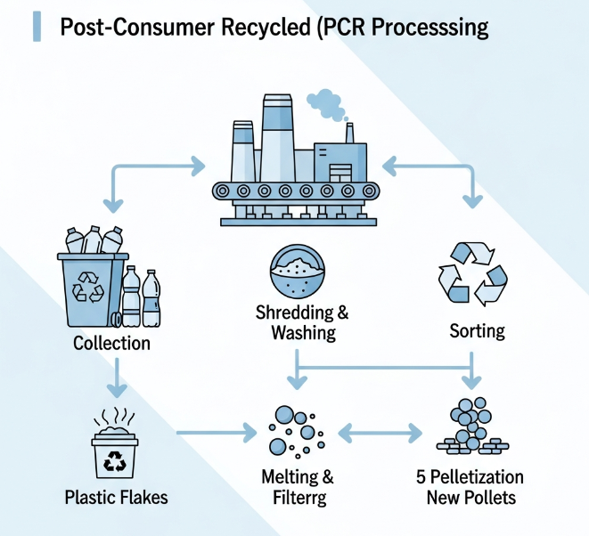 Definición: El material de PCR se deriva exclusivamente de productos que han sido utilizados por los consumidores finales, recolectados a través de programas de reciclaje establecidos y desviados de vertederos u océanos. Esto incluye artículos cotidianos como botellas de agua de plástico usadas, envases de yogur, jarras de detergente y latas de aluminio.